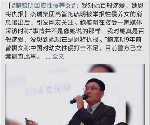 提起鲍某明,可能很多人并不熟悉。但这个案件却让这个名字成为了全国人民的焦点。鲍某明,一个看似普通的男子,却涉嫌性侵自己的养女。这个案件最早是在2020年5月被曝光的,当时,养女小丽(化名)通过网络平台向外界求助,揭露了鲍某明的罪行。